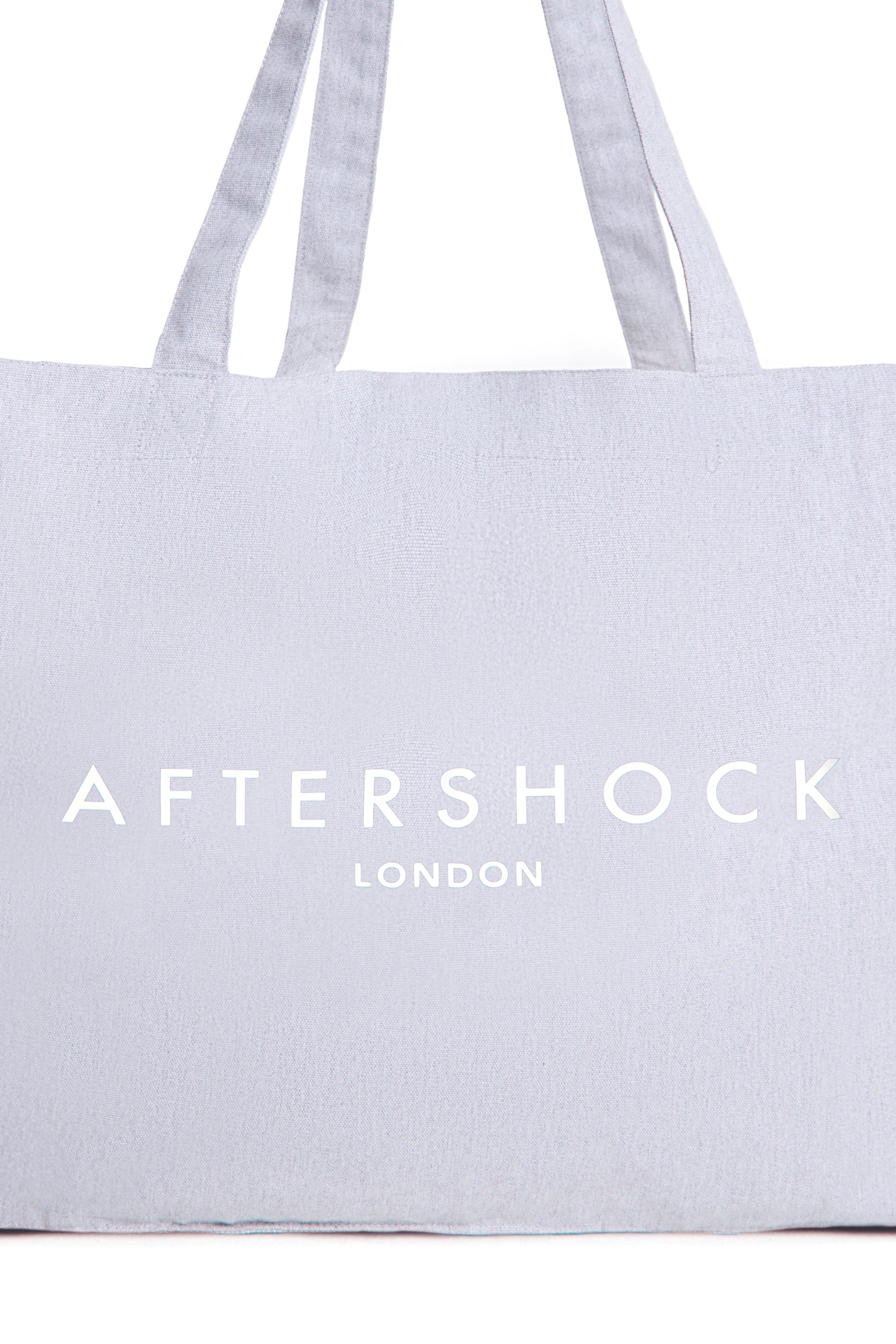 Made from a durable recycled cotton blend, The Aftershock London Canvas Tote Bag in Silver Grey features a large spacious body with two carry handles and Aftershock London print.